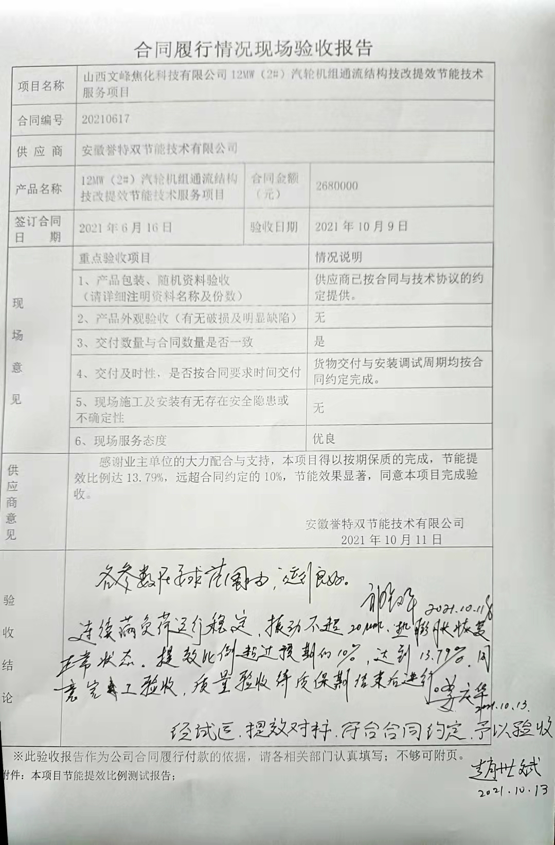 本項(xiàng)目客戶驗(yàn)收評價(jià)為“各參數(shù)在要求范圍內(nèi),運(yùn)行良好;連續(xù)滿負(fù)荷運(yùn)行穩(wěn)定,振動(dòng)不超出2絲,熱鼓脹恢復(fù)正常狀態(tài),提效比例超過預(yù)期的10%,達(dá)到13.79%,同意完工驗(yàn)收,質(zhì)量驗(yàn)收待質(zhì)保期結(jié)束后進(jìn)行;經(jīng)試運(yùn),提效對標(biāo),符合合同約定,予以驗(yàn)收”。
