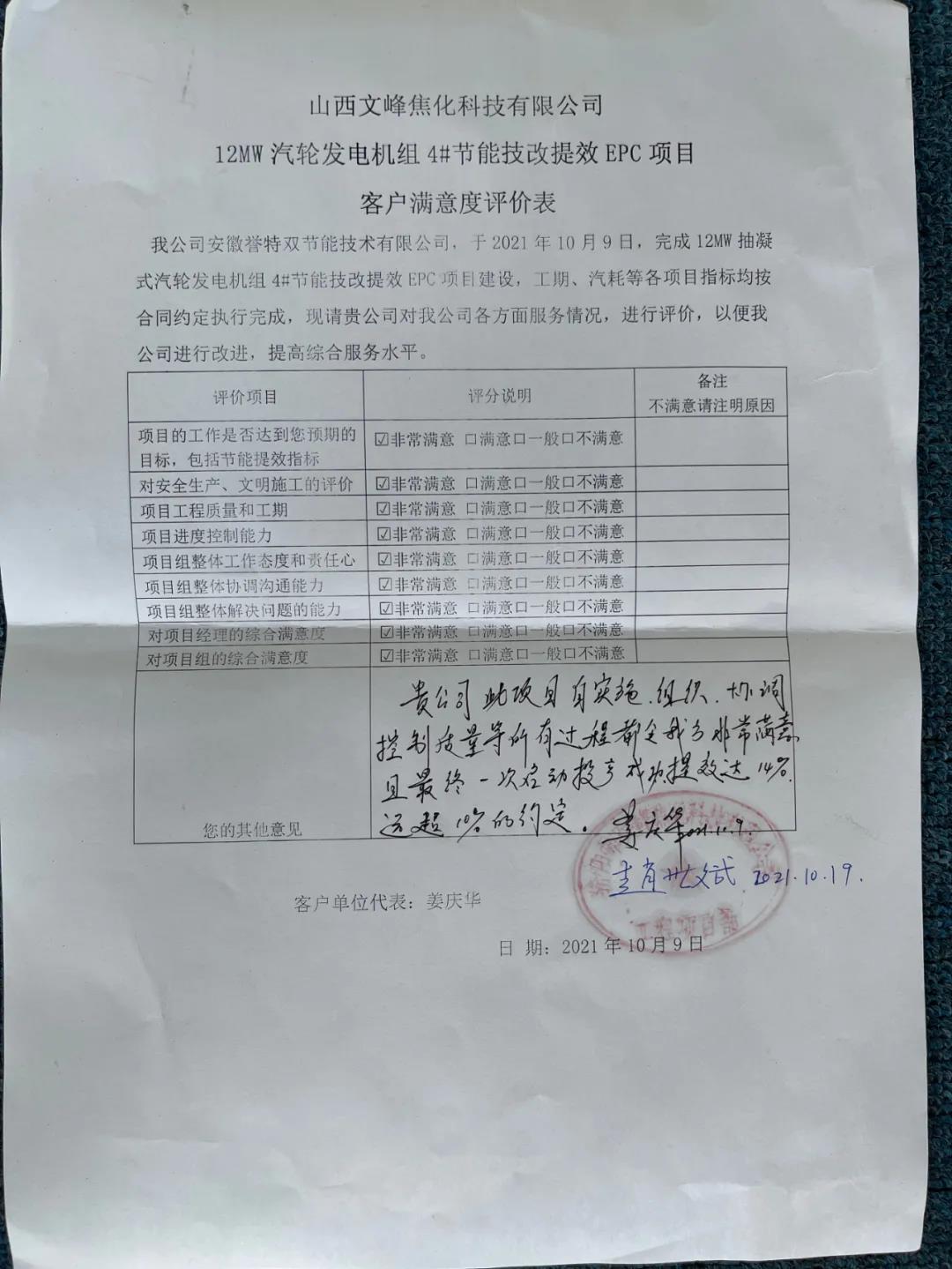同時(shí),客戶對我公司的項(xiàng)目建設(shè)綜合管理服務(wù)水平給予高度評價(jià),對我公司在項(xiàng)目建設(shè)過程中勇于創(chuàng)新、敢于碰硬的優(yōu)良作風(fēng)給予高度贊揚(yáng),在此,我公司誠摯對用能單位、外協(xié)兄弟單位、項(xiàng)目負(fù)責(zé)的各位同事致以崇高的敬意和衷心的感謝!
