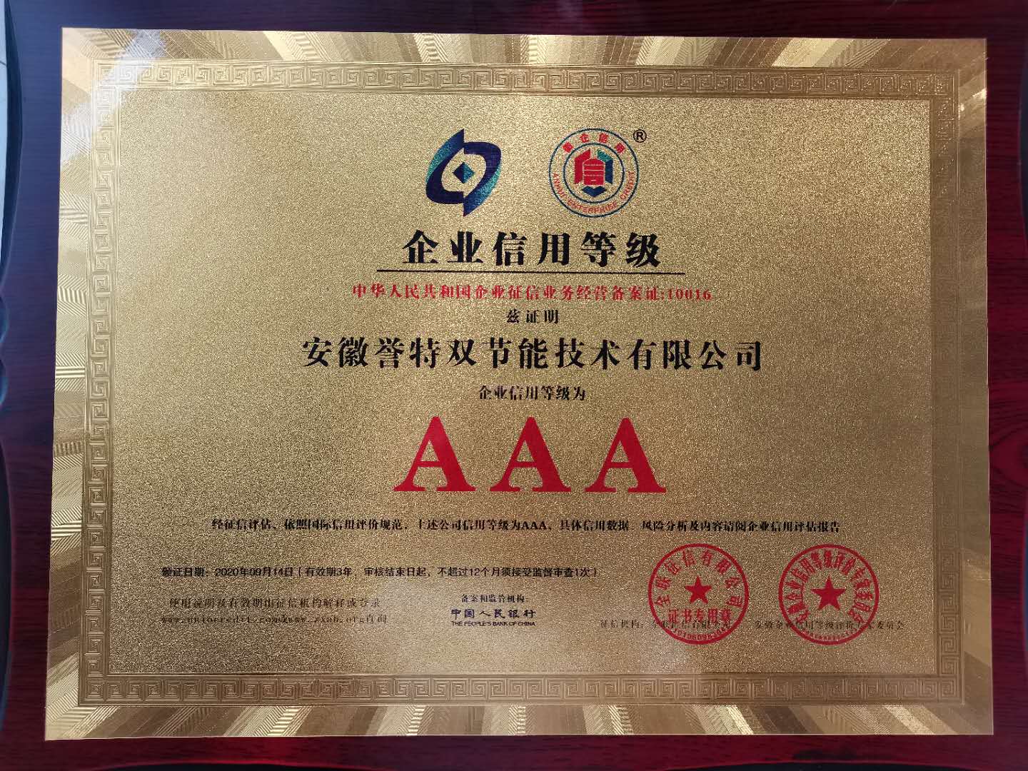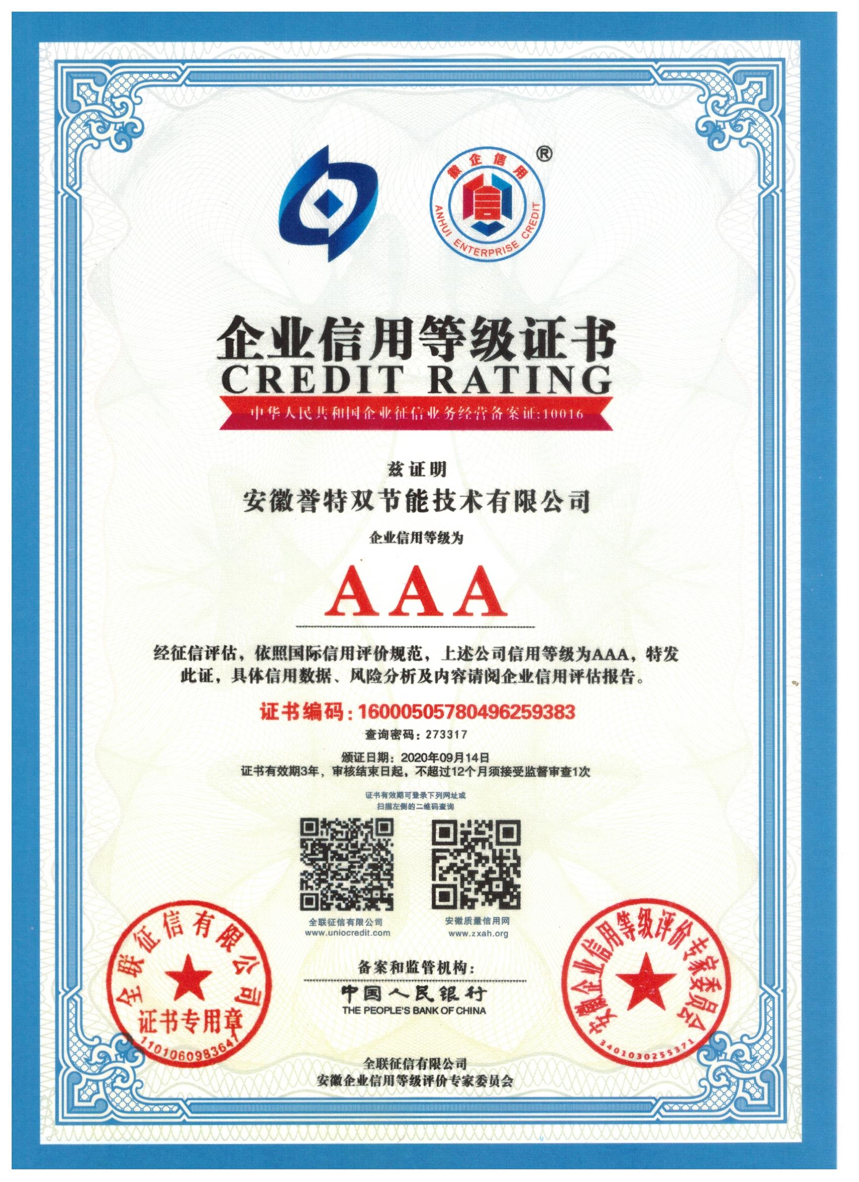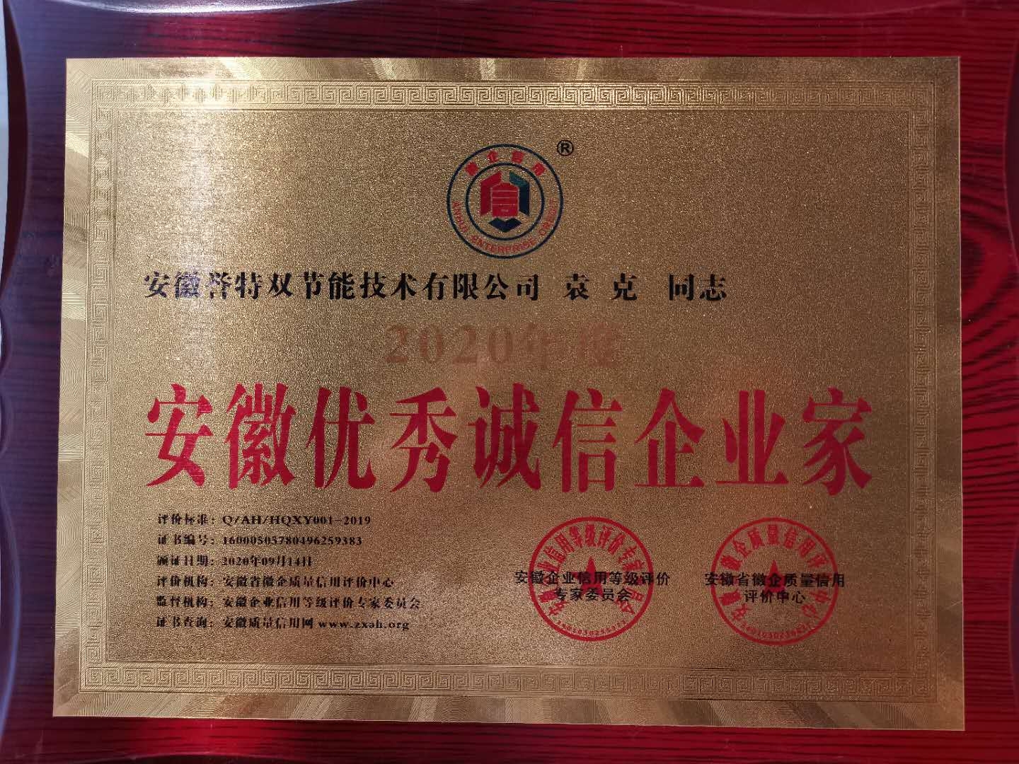 此次公司入選“安徽AAA級(jí)信用企業(yè)”,總經(jīng)理袁克同志獲評(píng)2020年度“安徽省優(yōu)秀誠(chéng)信企業(yè)家”,榮譽(yù)稱號(hào),即是榮耀,更是鞭策,公司將不斷提高企業(yè)信用建設(shè),發(fā)揮企業(yè)信譽(yù)優(yōu)勢(shì),為國(guó)家節(jié)能環(huán)保事業(yè)做出更大的貢獻(xiàn)!