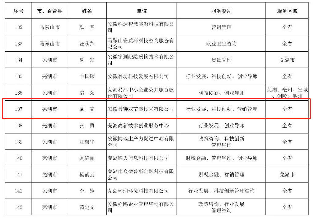 7月13日,安徽省中小企業(yè)志愿服務(wù)專家名單第一批,經(jīng)省經(jīng)信廳、省民政廳審核、認(rèn)定,并正式予以公布。我公司總經(jīng)理袁克同志榮登榜單,喜獲認(rèn)定,同時(shí)也是蕪湖市唯一的節(jié)能環(huán)保產(chǎn)業(yè)入選單位。