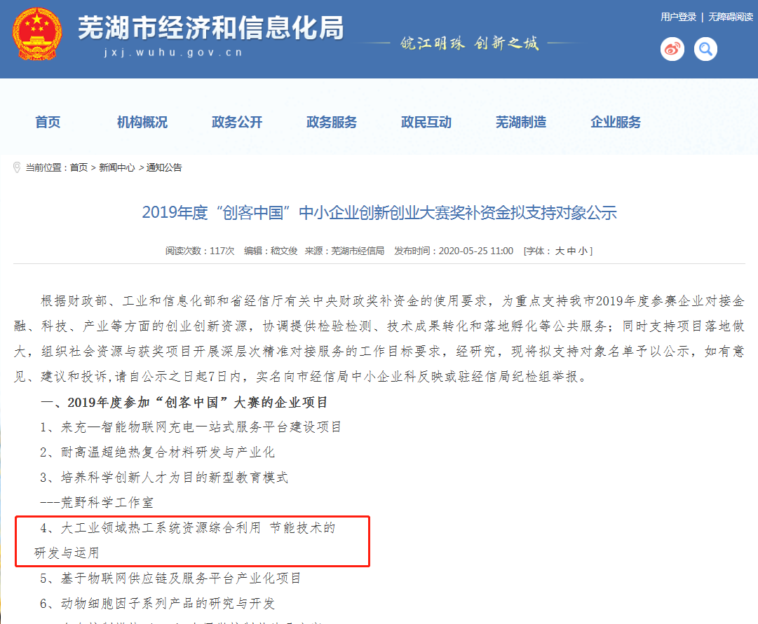 快訊--我公司創(chuàng)業(yè)項(xiàng)目獲2019年度“創(chuàng)客中國”中小企業(yè)創(chuàng)新創(chuàng)業(yè)大賽蕪湖市第四名,并取得獎(jiǎng)補(bǔ)資金支持