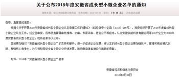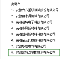 2018年8月29日,安徽省經(jīng)信委通過官網(wǎng)發(fā)布——2018年度安徽省成長型小微企業(yè)認(rèn)定名單,我公司安徽譽特雙節(jié)能技術(shù)有限公司喜獲認(rèn)定,為蕪湖市僅有的八家上榜企業(yè)之一,也是蕪湖國家級經(jīng)濟(jì)技術(shù)開發(fā)區(qū)和蕪湖高新技術(shù)創(chuàng)業(yè)園區(qū)唯一的入選企業(yè),含金量頗高。
