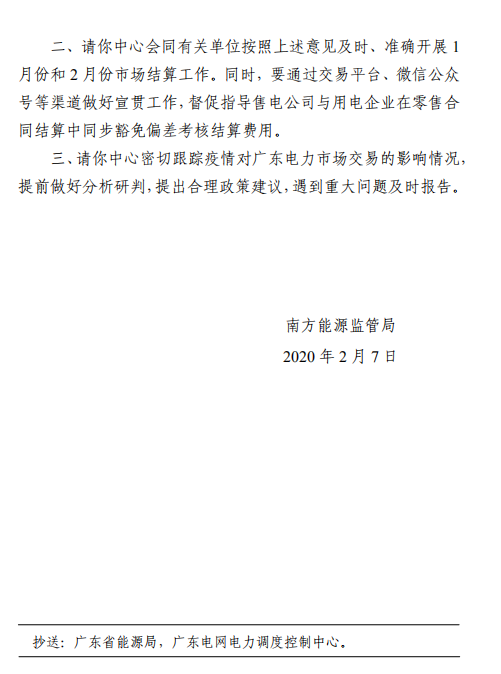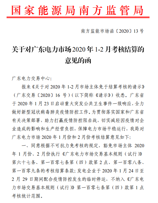 北極星售電網(wǎng)訊:北極星售電網(wǎng)獲悉,近日南方能監(jiān)局發(fā)布《關于對廣東電力市場2020年1-2月考核結算的意見的函》,豁免市場主體 2020年 1 月份、2 月份執(zhí)行《廣東電力市場交易基本規(guī)則(試行)》第六十七條、第一百零七條第(四)款第 2 點、第一百零八條、第一百零九條的考核結算條款;發(fā)電企業(yè)于 2020 年 1 月 24 日至2 月 29 日期間配合疫情防控發(fā)生的臨時停運,不納入《廣東電力市場交易基本規(guī)則(試行)》第一百零七條第(四)款第 1 點考核統(tǒng)計范圍。