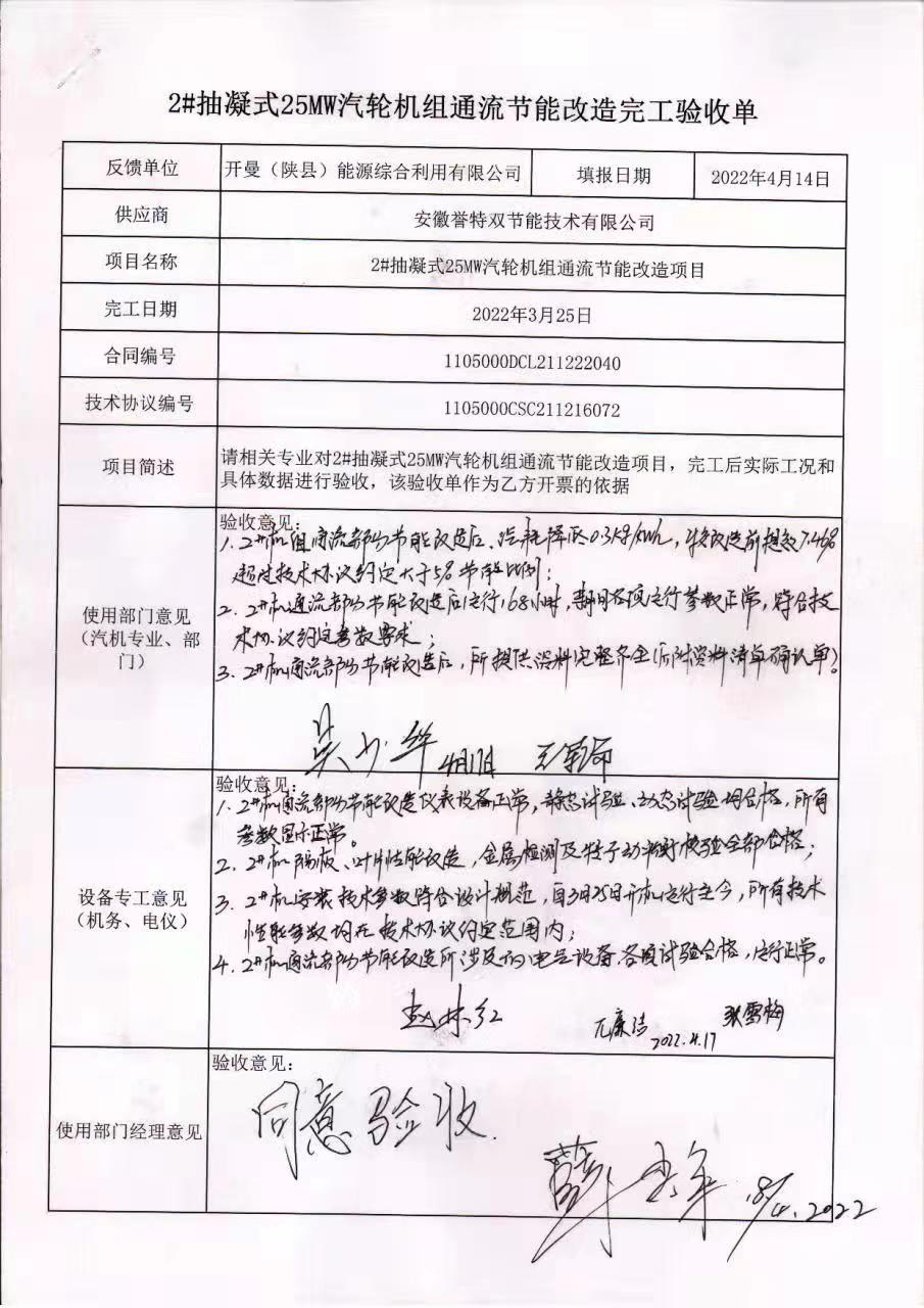 近日,我公司承接的三門峽開曼(陜縣)能源綜合利用有限公司25MW抽凝式2#汽輪機組通流結(jié)構(gòu)技改提效EPC項目,順利通過工程驗收,實測節(jié)能提效比例高達(dá)7.46%,遠(yuǎn)超合同約定的5%考核指標(biāo),在此表示熱烈祝賀!