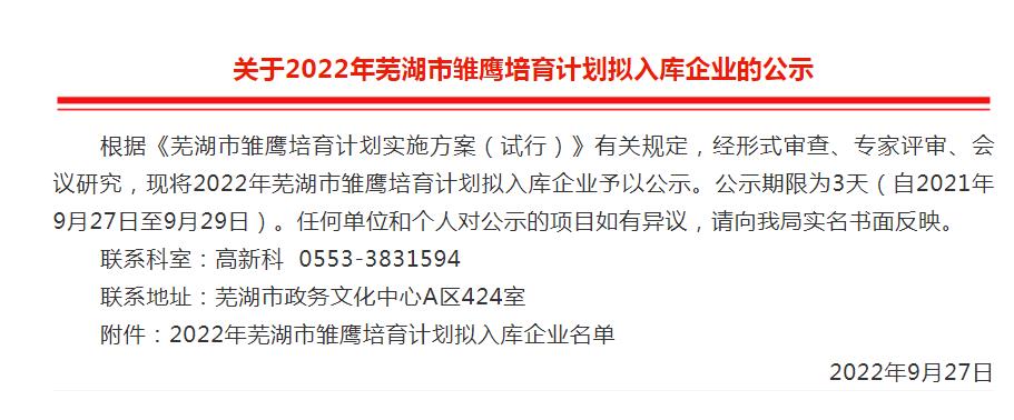 喜訊——公司入選2022年蕪湖市雛鷹培育計劃名單
