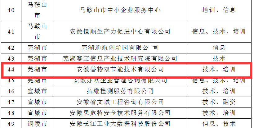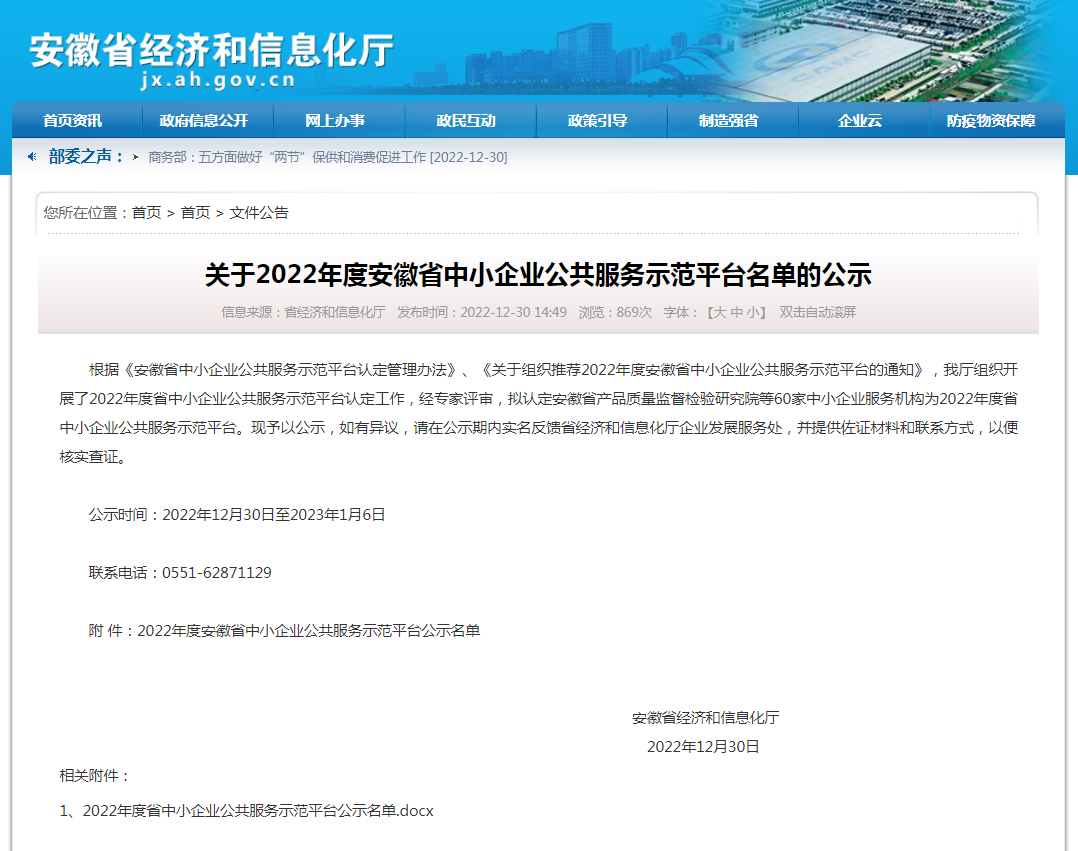 2022年12月30日,安徽省經(jīng)濟和信息化廳發(fā)布《關于公布2022年度安徽省中小企業(yè)公共服務示范平臺名單的通知》,我公司再次被認定為2022年度安徽省中小企業(yè)公共服務示范平臺。本次全省共計評選出60家中小企業(yè)公共服務示范平臺,其中蕪湖市僅4家,我公司榮列榜單。
