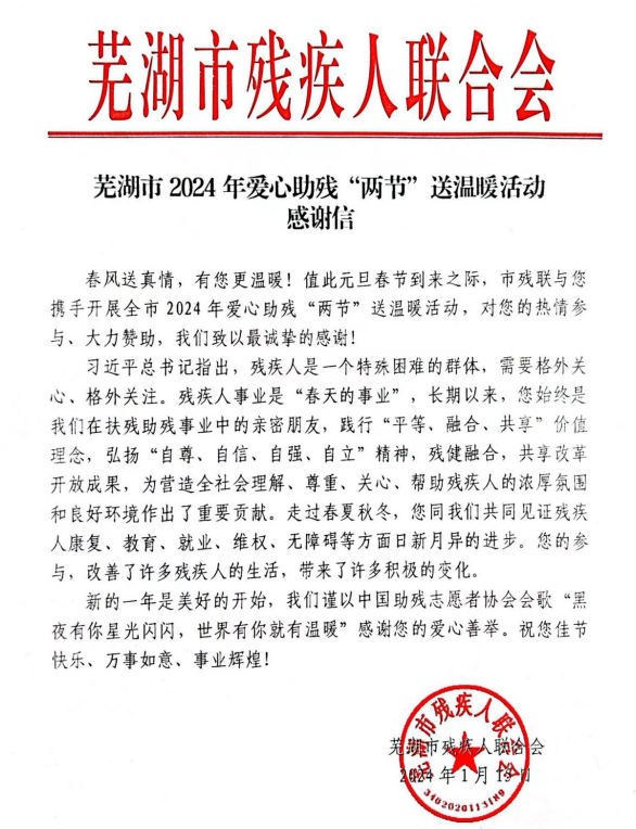 公司積極參加蕪湖市2024年愛心助殘“兩節(jié)”送溫暖活動(dòng)