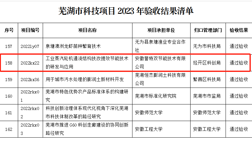 2024年2月22日,蕪湖市科學(xué)技術(shù)局發(fā)布《關(guān)于蕪湖市科技項(xiàng)目2023年驗(yàn)收結(jié)果的通報(bào)》,我公司項(xiàng)目——工業(yè)蒸汽輪機(jī)通流結(jié)構(gòu)技改提效節(jié)能技術(shù)的研發(fā)與應(yīng)用順利通過驗(yàn)收!