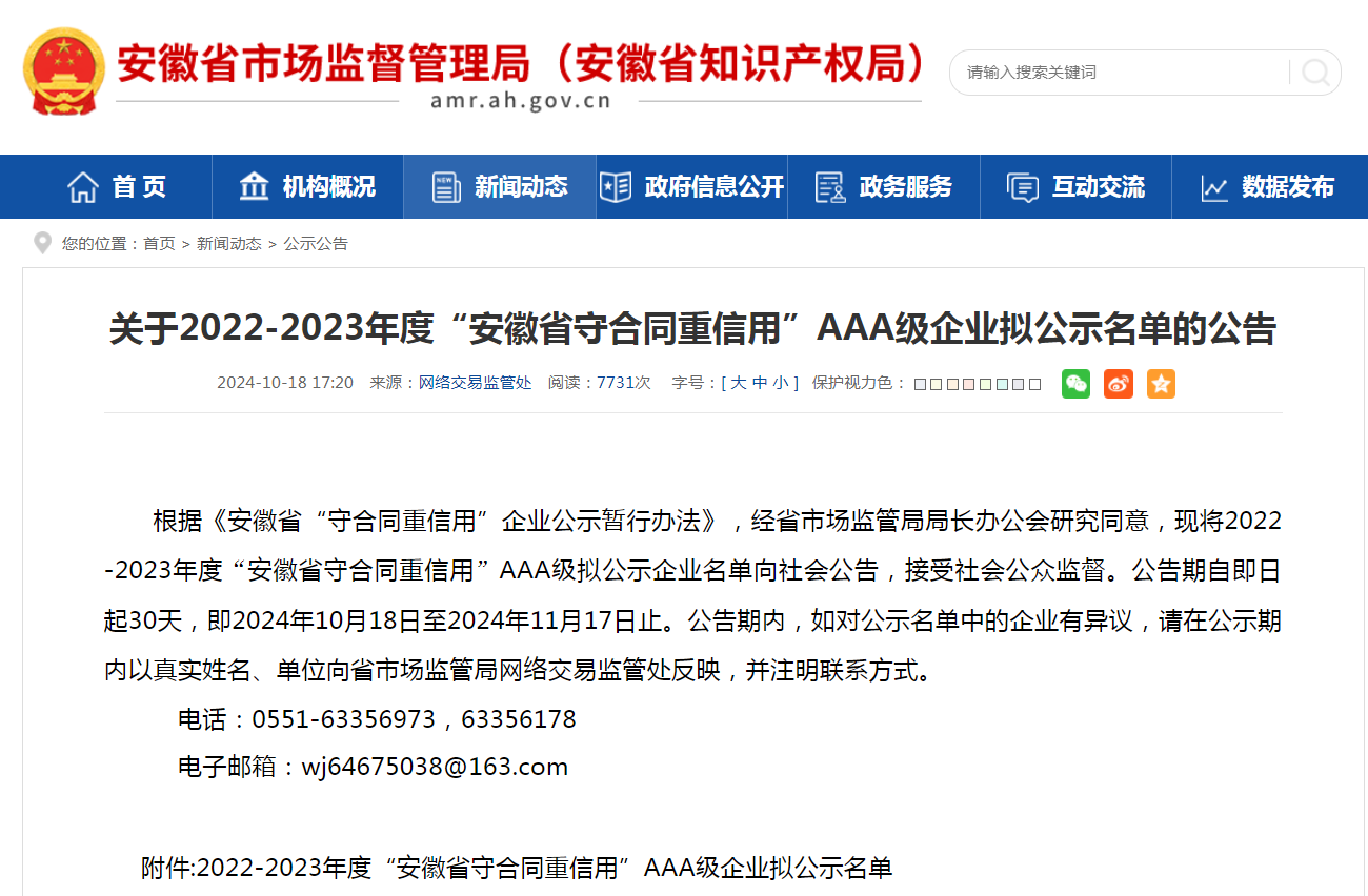 為推動企業(yè)誠信建設、賦能企業(yè)高質量發(fā)展,安徽省市場監(jiān)督管理局經統一部署,組織開展了2024年度安徽省“守合同重信用”企業(yè)評選公示活動,通過對申報的企業(yè)進行資料復核、征信查詢、合同執(zhí)行、業(yè)績數量、市場口碑、企業(yè)形象、行業(yè)影響等各方面進行評估,經嚴格的實地核實、綜合評判,遴選出一批行業(yè)影響力大、品牌信用度高的經營發(fā)展態(tài)勢良好的企業(yè),我公司榮幸被評選為安徽省2022-2023年度“守合同重信用AAA級企業(yè)”,省內平均每個地級市全行業(yè)僅在30家左右,含金量非常高,在此表示熱烈祝賀!