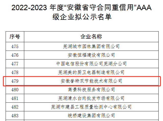 信譽是企業(yè)長期穩(wěn)定發(fā)展的根基,反映企業(yè)在運營過程中的經營理念和發(fā)展宗旨,信譽程度在對外商務往來中已成為重要環(huán)節(jié)。本次入選安徽省守合同重信用AAA級企業(yè),綜合體現了我公司財務狀況良好、企業(yè)文化優(yōu)秀、社會信譽度高,在經營過程中無違法亂紀行為、無不良信用記錄等,樹立了良好的標桿示范形象,公司也將繼續(xù)秉承守合同重信用經營理念,為國家節(jié)能環(huán)保事業(yè)做出更大的貢獻,一諾千金,合作共贏!