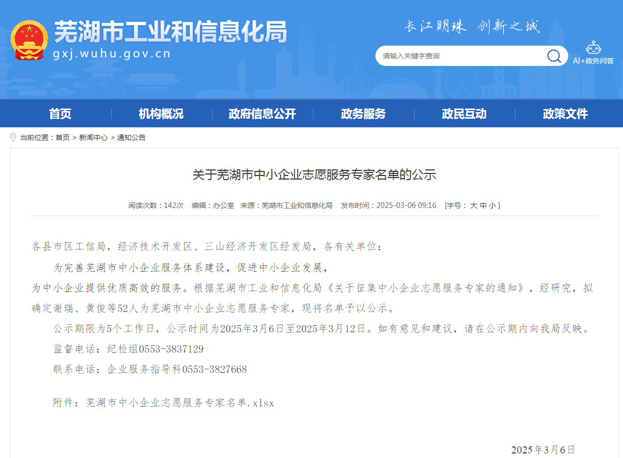 2025年3月6日,為完善蕪湖市中小企業(yè)服務(wù)體系建設(shè),促進中小企業(yè)發(fā)展,為中小企業(yè)提供優(yōu)質(zhì)高效的服務(wù),由市工信局牽頭在全市范圍內(nèi)開展志愿專家征集評選工作,并最終確定52名各行業(yè)人員組成志愿專家團,我公司總經(jīng)理袁克、節(jié)能事業(yè)部長湯偉兩位同志入選,在此表示熱烈祝賀。