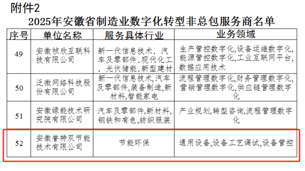 根據(jù)《安徽省工業(yè)和信息化廳關(guān)于公開(kāi)征集2025年度制造業(yè)數(shù)字化轉(zhuǎn)型服務(wù)商的通知》,經(jīng)各服務(wù)商提交申報(bào)材料、專(zhuān)家評(píng)審等程序,省工信廳最終確定發(fā)布203家服務(wù)商,我公司名列榜單,在此表示熱烈祝賀!